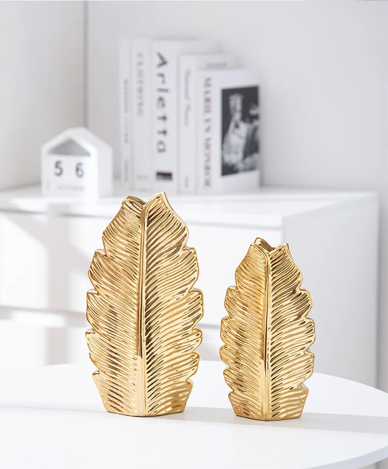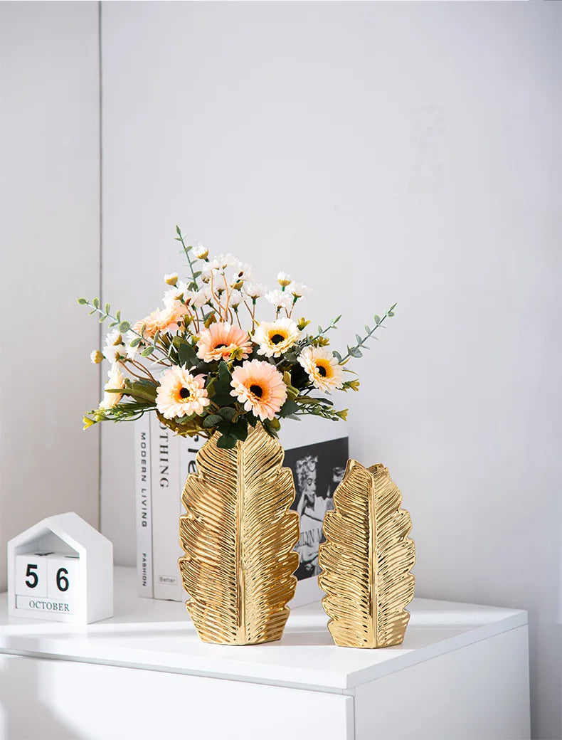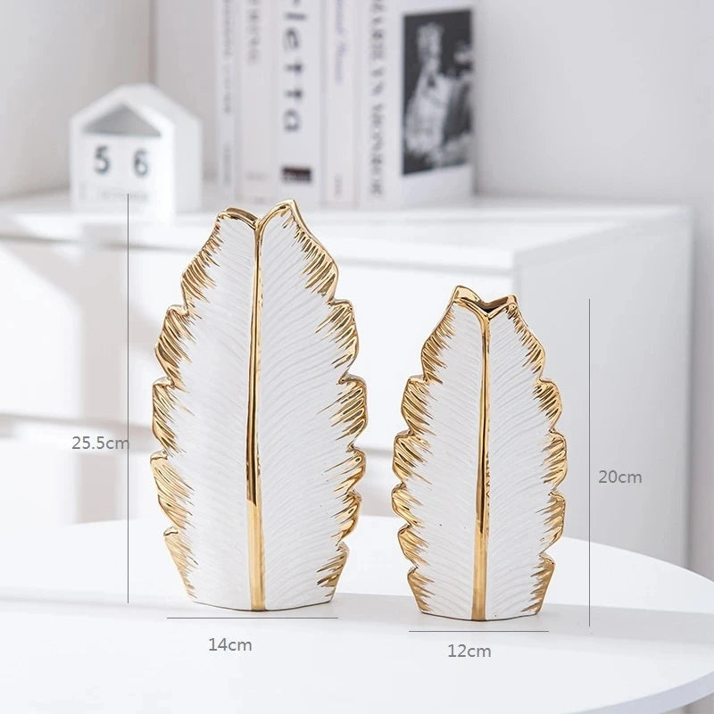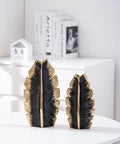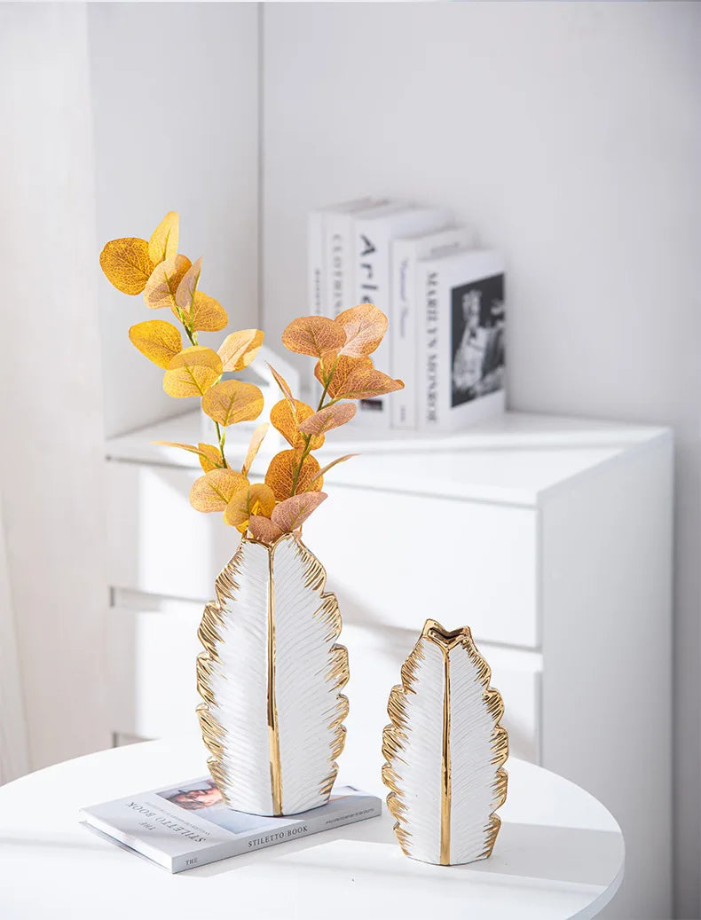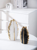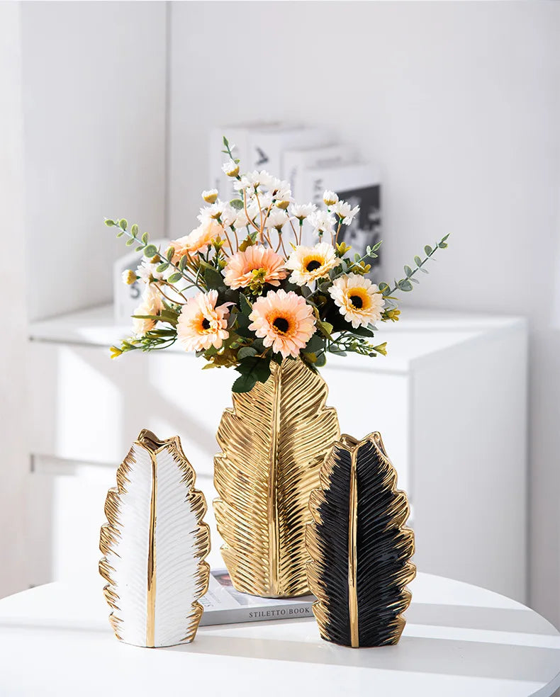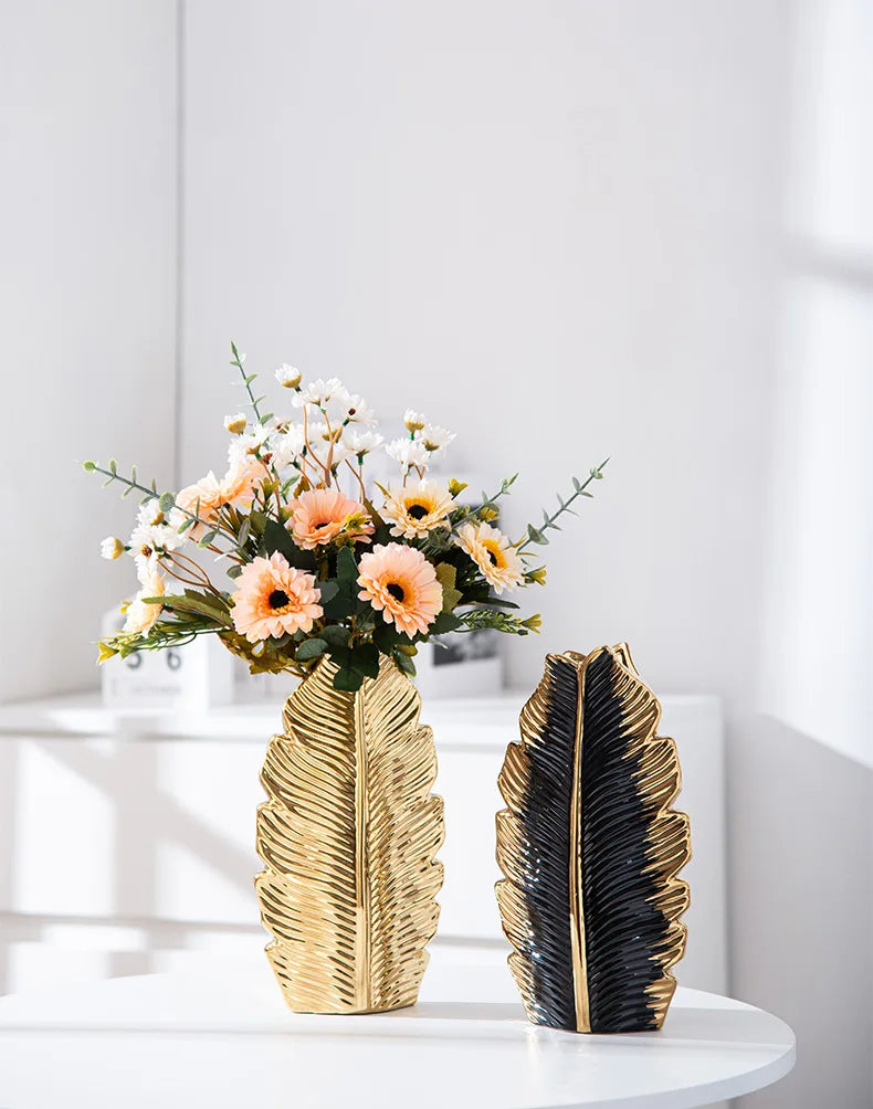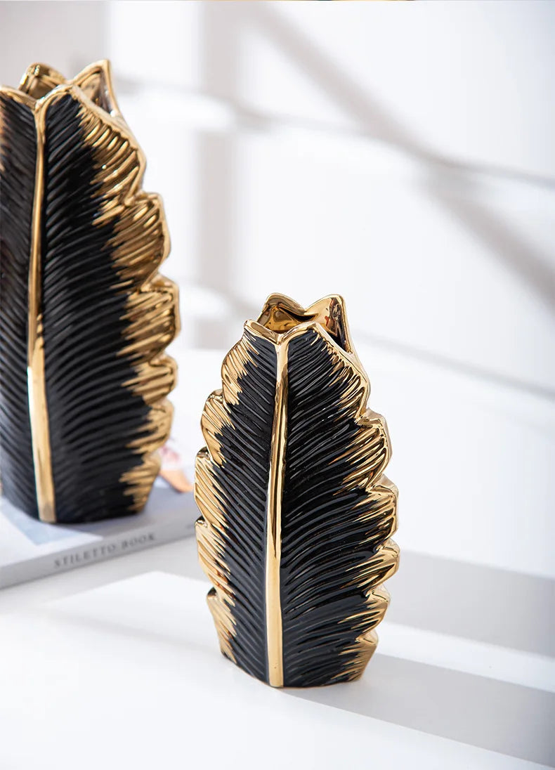 2Pcs Nordic Black Gold Ceramic Leaf Vases – Modern TV Cabinet Decor