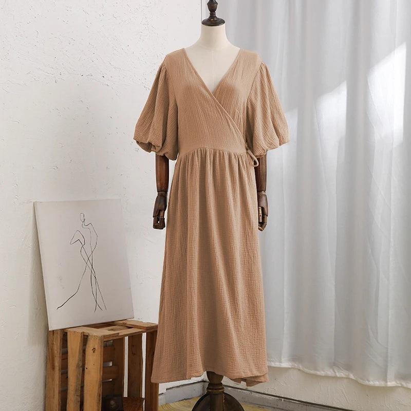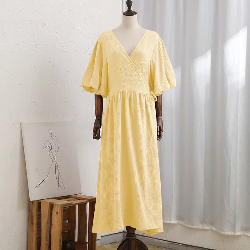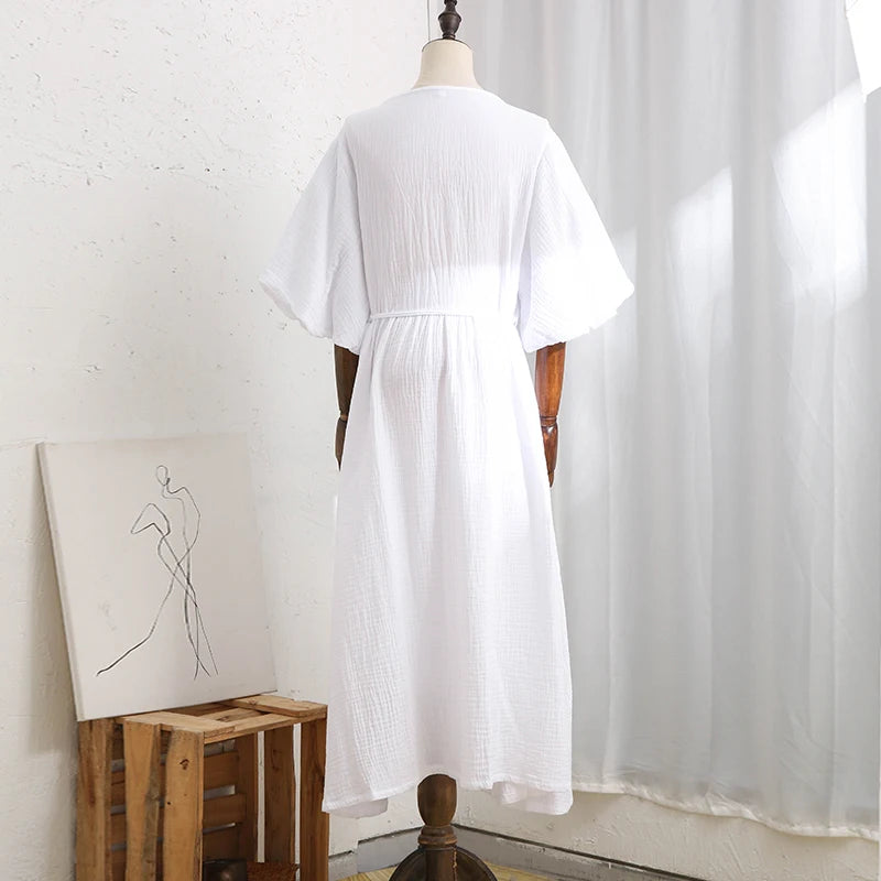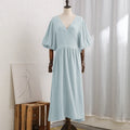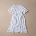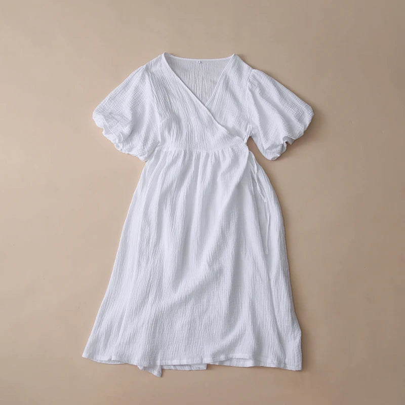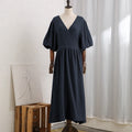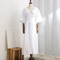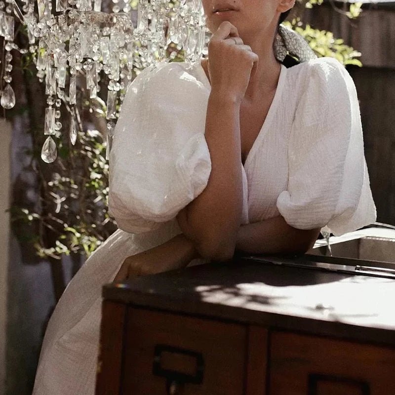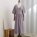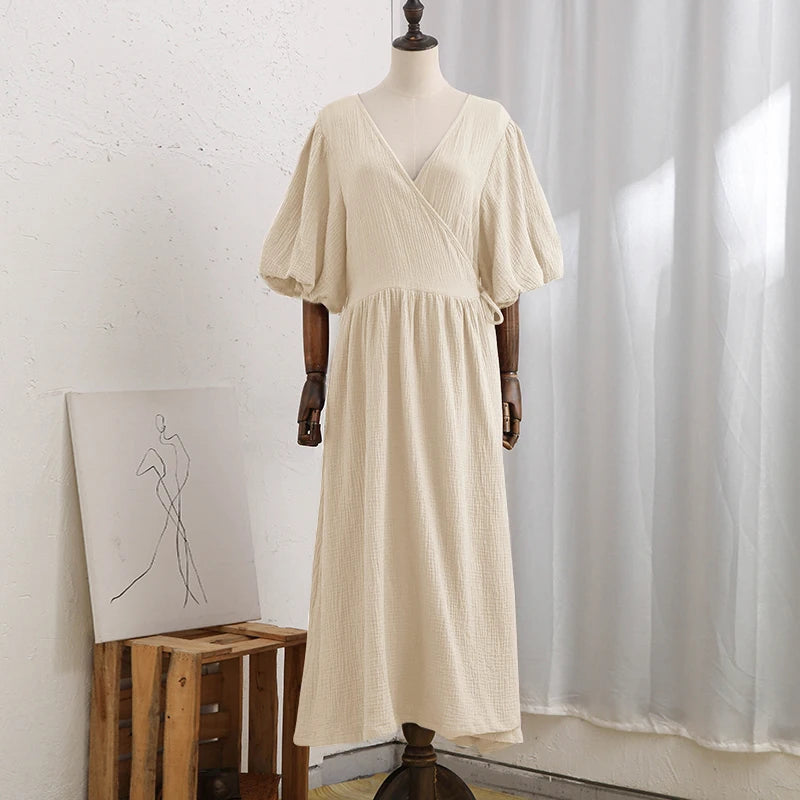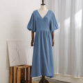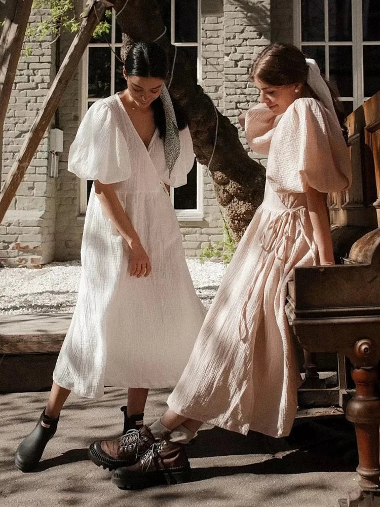 Women's Vintage V-Neck Puff Sleeve Lace-Up Maxi Dress in Elegant White