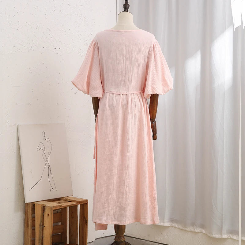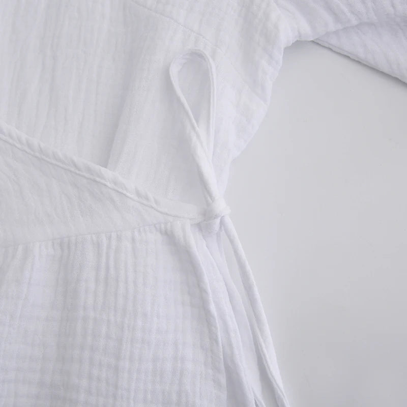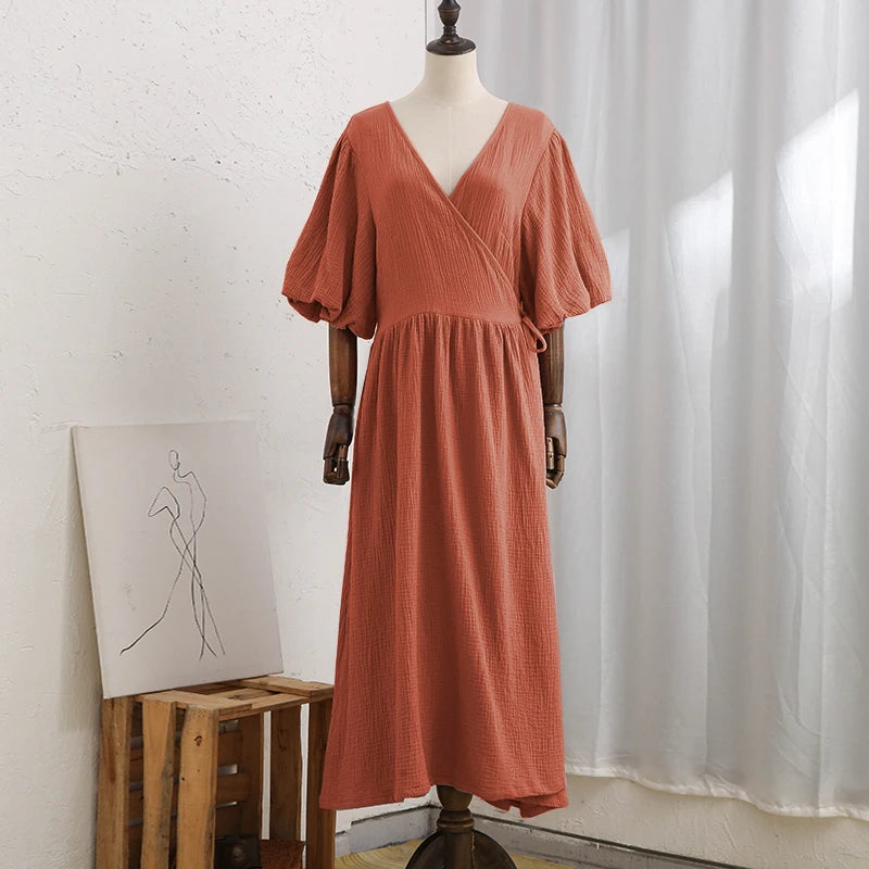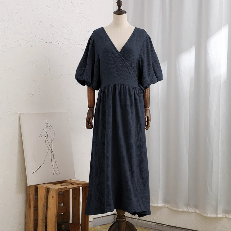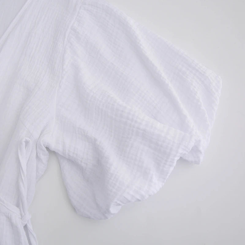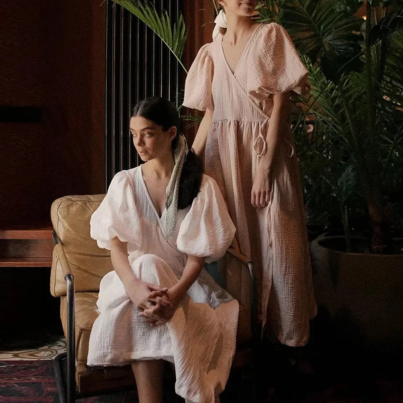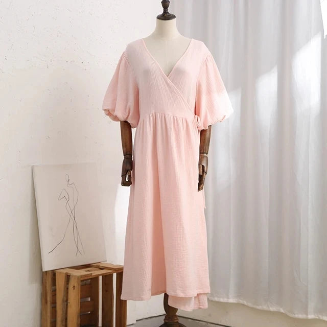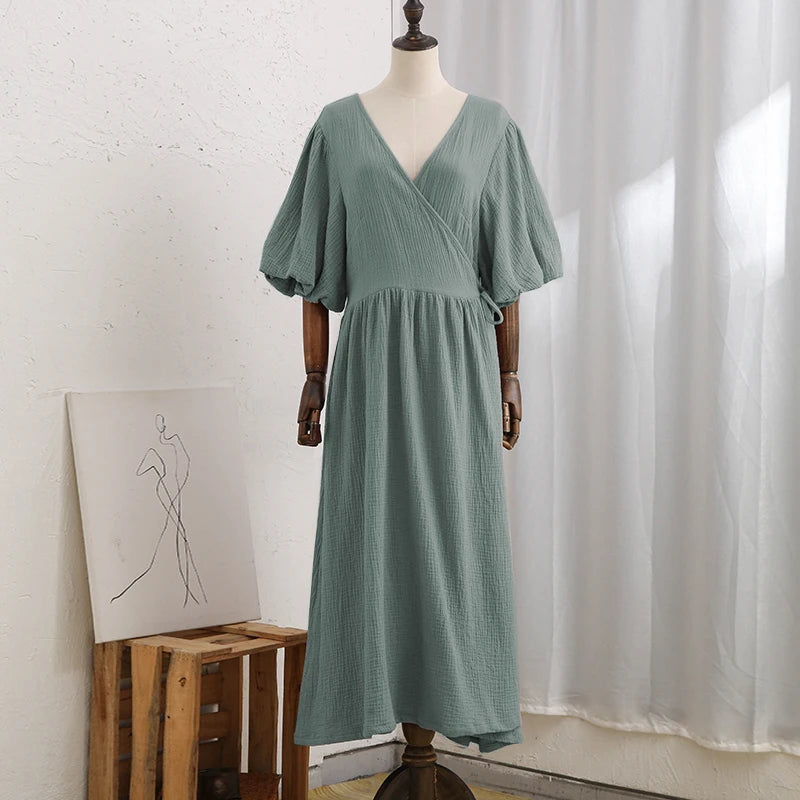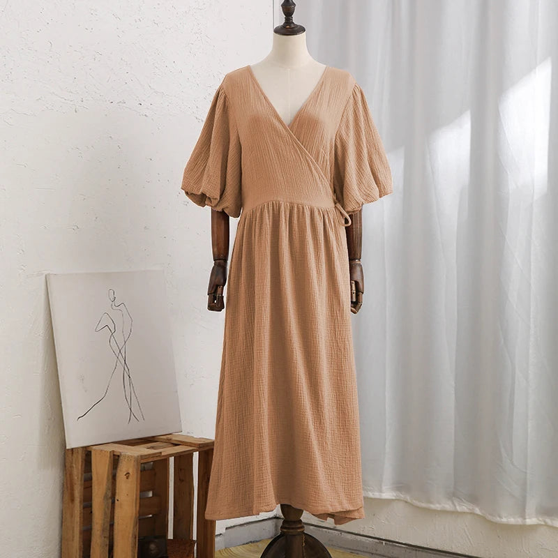 Women's Vintage V-Neck Puff Sleeve Lace-Up Maxi Dress in Elegant White