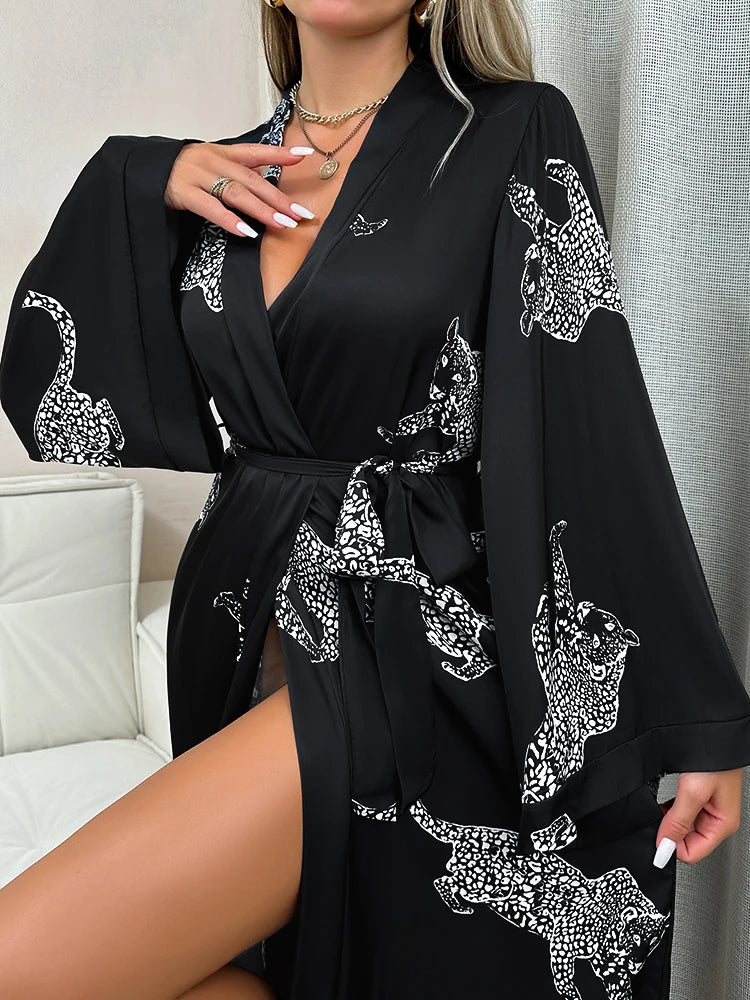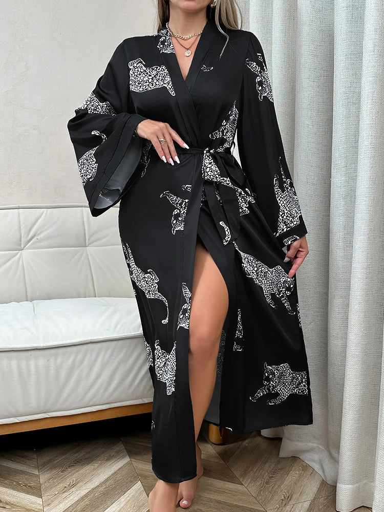 Long Satin Bathrobe with Belt – Cheetah Print Sleepwear for Women